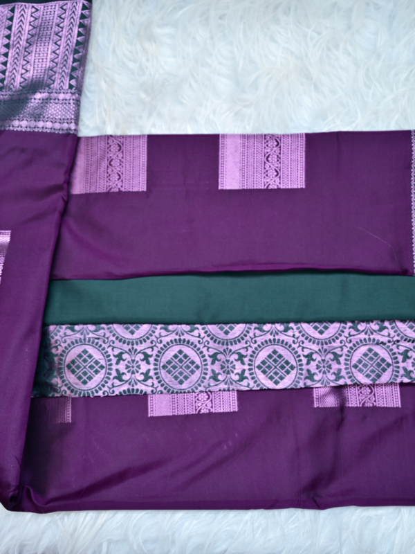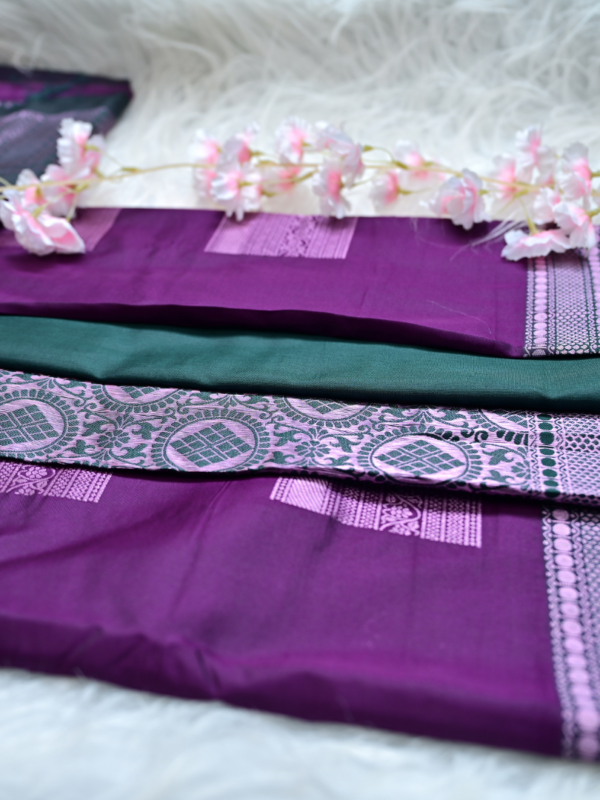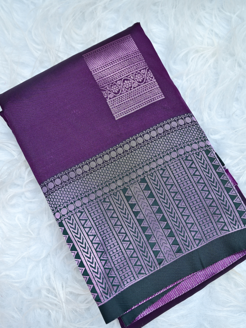 This premium blend offers the signature luxurious drape and beautiful sheen of traditional Kanjivaram, ensuring a graceful and lightweight wear