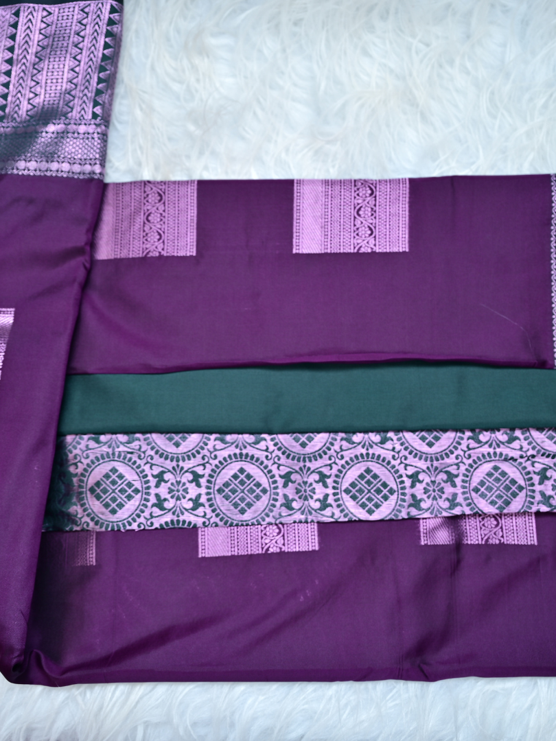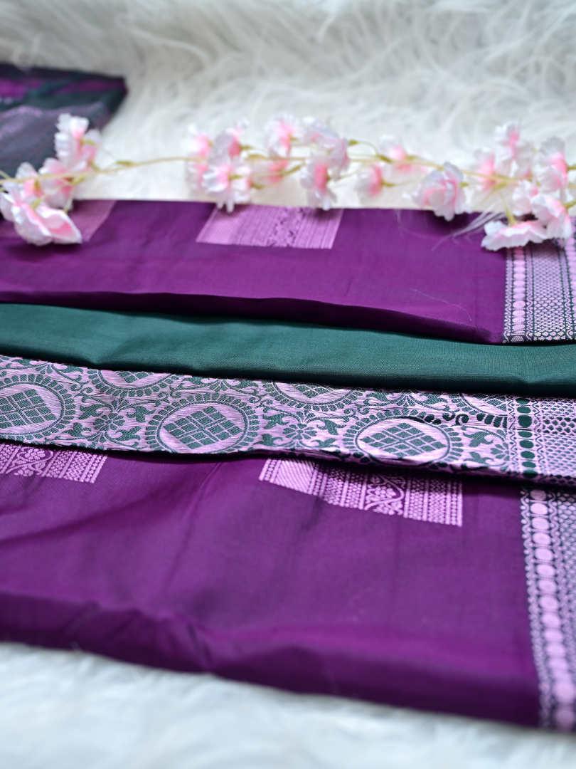 The entire body of the saree is adorned with Lavender Zari weaving Buttas, creating a delicate yet pervasive sparkle that is both unique and refined. This soft, feminine hue of zari provides a stunning contrast to the saree's main color. The drape is elegantly framed by a bold contrast border and a magnificent pallu, both richly woven with the same intricate Lavender Zari work.