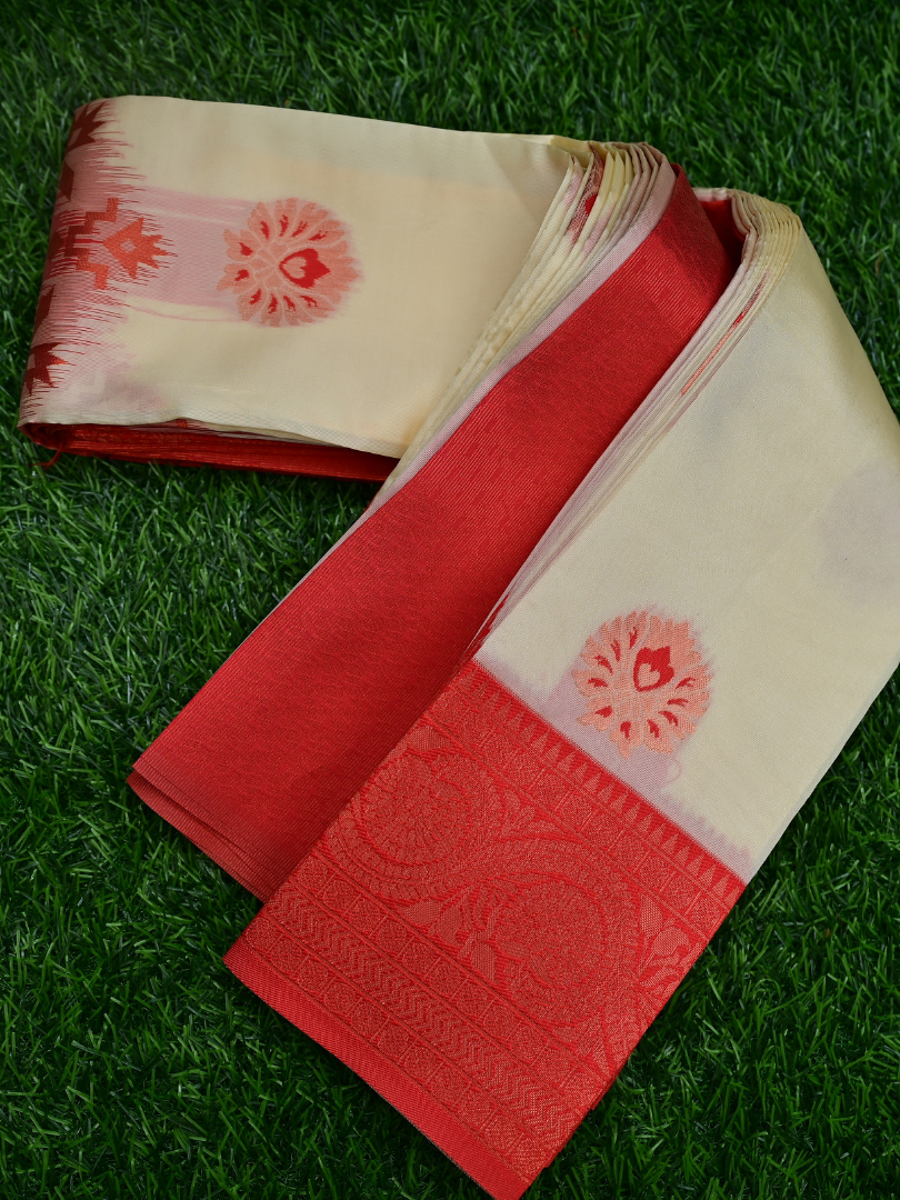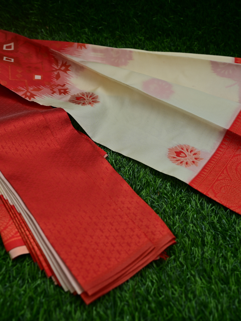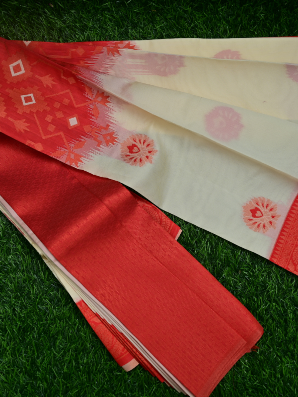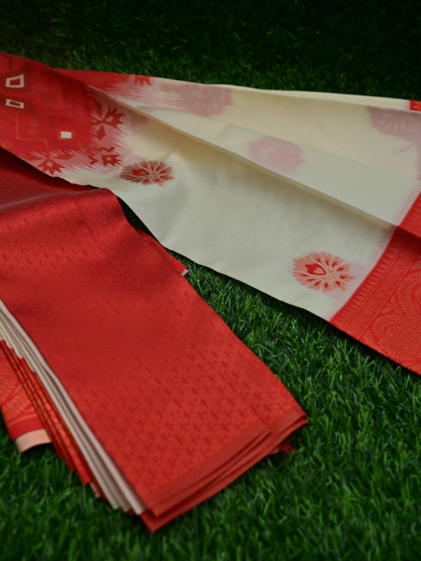 The body of the saree showcases intricate geometric weaving patterns at the centre, lending a modern, refined aesthetic that contrasts beautifully with classic design elements. This sophisticated structure is framed by a rich contrast brocade pallu, heavily woven with dazzling zari motifs that cascade with celebratory grandeur.