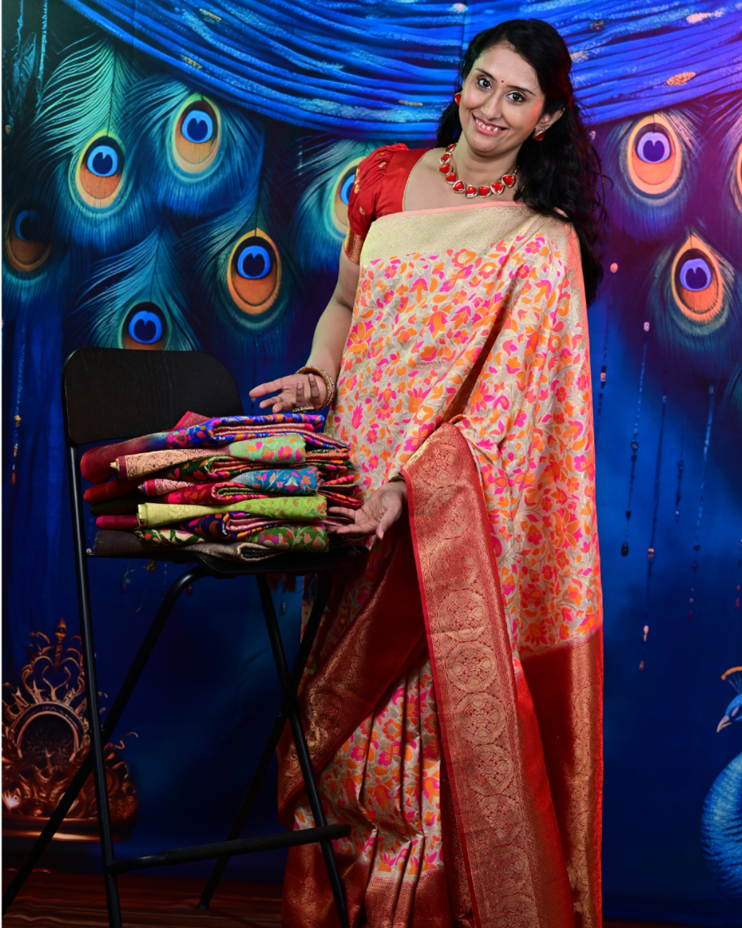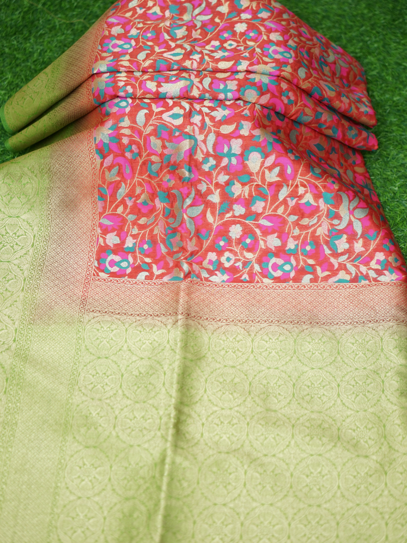 Enter a world of intricate color and artistry with this stunning Saree. This piece is a celebration of fine craftsmanship, featuring full multicolour weaving across the body