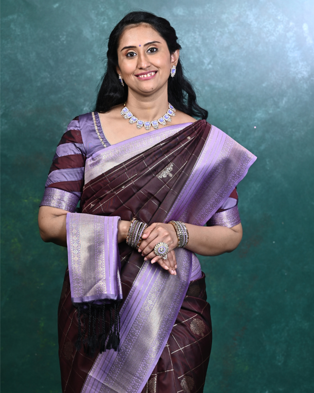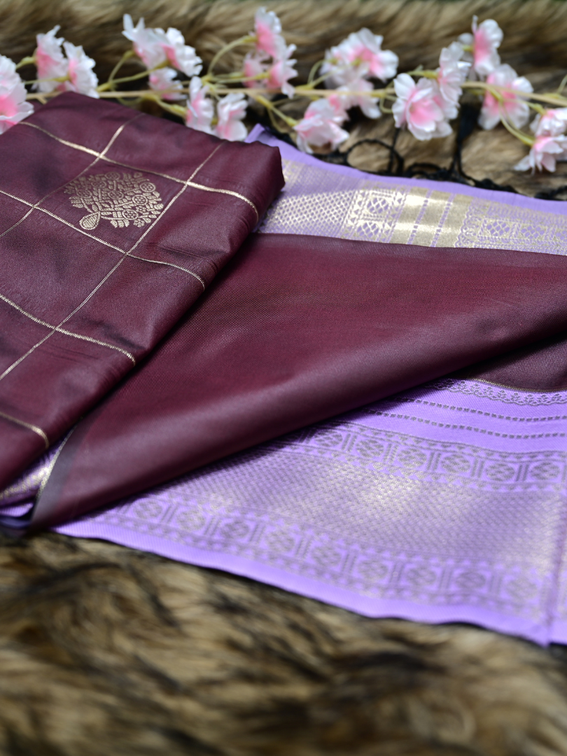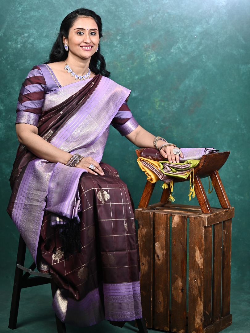 Fabric: Crafted from a premium Kanchi semi-silk blend, known for its opulent sheen, soft texture, and flowing drape that holds its pleats beautifully.