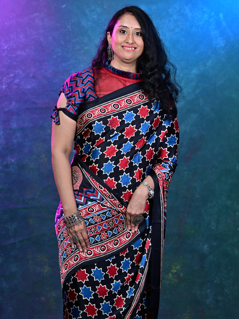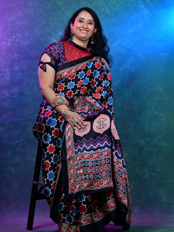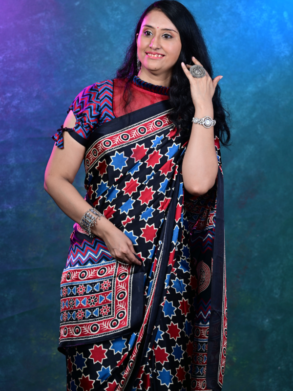 The saree is a canvas for the intricate Ajrakh printing technique, known for its deep, rich colors (typically indigo, madder, and black) and complex geometric or floral patterns. Each print tells a story of the Kutch region, bringing a piece of genuine Indian textile tradition to your wardrobe.
